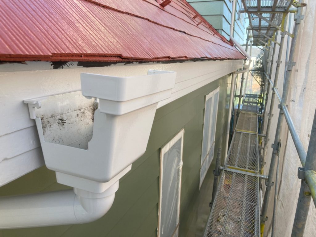 現在熊谷市瀬南 O様邸 外壁屋根塗装工事では、窯業系サイディング外壁の塗装が下塗り~上塗りまで終了し、屋根の塗装を進めています。サイディング外壁は下地が傷んでいたので、下塗り2回仕様。浸透性シーラーで傷んだ下地にしっかりと浸透させて下地を強化し、窯業系サイディングボード用の下塗り材 日本ペイント パーフェクトサーフを塗装。下地をきれいに整えて上塗りに移りました。