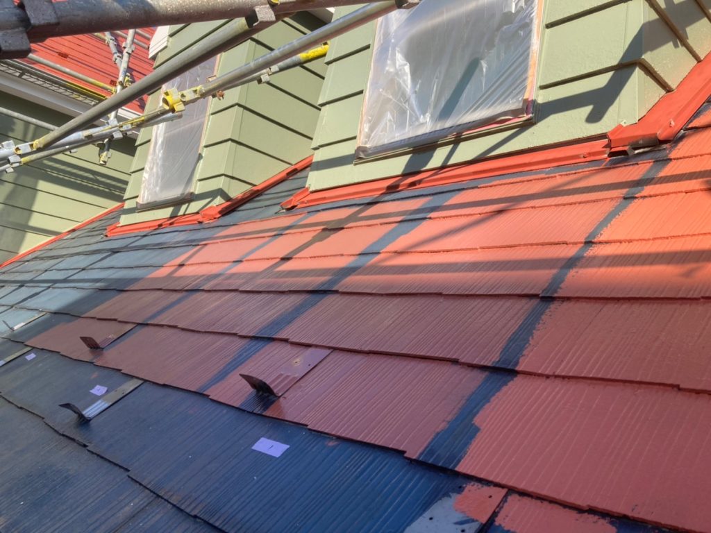 屋根の色は、ローマオレンジという明るめのオレンジ色をお選びいただきましたが、実際に屋根を塗装してみると想像以上に想像以上に明るくお客様のイメージと違うということになり、屋根3回目塗装の仕上げ色にて色を調整することになりました。もう少しくすんだ感じを表現するため、3パターン屋根色を調色してイメージを確認してもらっています。
