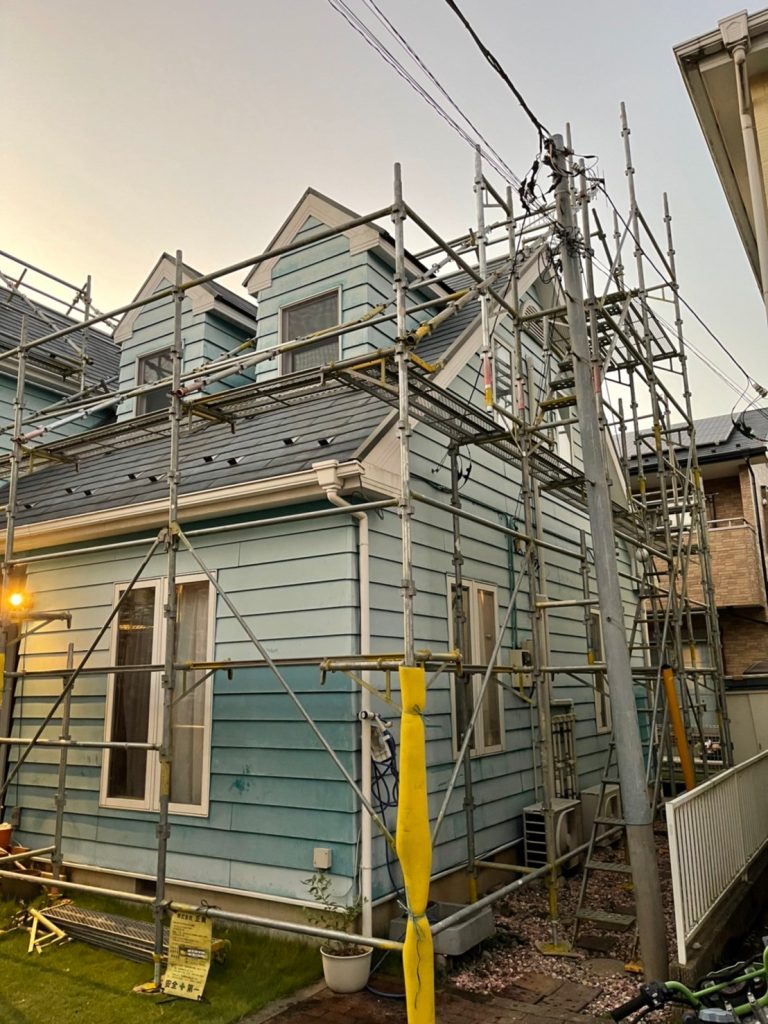 ↑こちらはO様邸 外壁屋根塗装工事 施工前。もともとは淡いブルー系の外壁にブラックの屋根色。建物が洋風のお洒落な作りなので、色選びもたのしみが増えます!今回は数パターンのカラーシミュレーションCGを作成した結果、ブールジョンという若干くすんだグリーンをお選びいただきました。