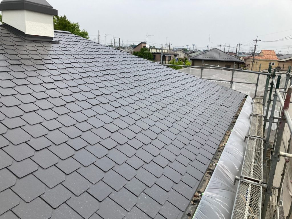 ↑こちらは屋根 中塗りの様子。今回は下塗りに日本ペイント ファインパーフェクトベスト強化シーラー、上塗りには、日本ペイント ファインパーフェクトベストを使用いたしました。お手頃ながらも高耐久の塗料です。