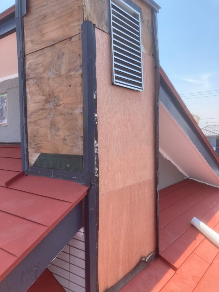 ↑こちらは、2F大屋根部分にある外壁サイディングを剥がした後の写真。この部分から雨漏れが起きており、下地からやり直すために一度外壁を剥がしました。なんと、サイディングを剥がしたあとにわかったのですが、写真にある下地の合板が腐っているだけでなく、本来新築時に施工してあるであろう透湿防水シートの施工もしてなかったのです。