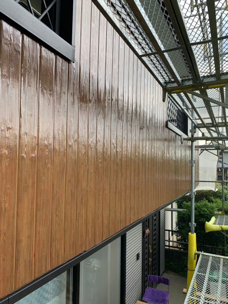 ↑こちらはバルコニー外壁 木目調サイディング部分。こちらは前回の外壁塗装の際に張り替えた木目調のサイディング。きれいな木目を生かすために、無機ハイブリッド塗料 KFケミカル ワールドセラグランツ クリアー塗装。ちょっとサービスして3回塗りしたので、とてもきれいにな艶が出ています。