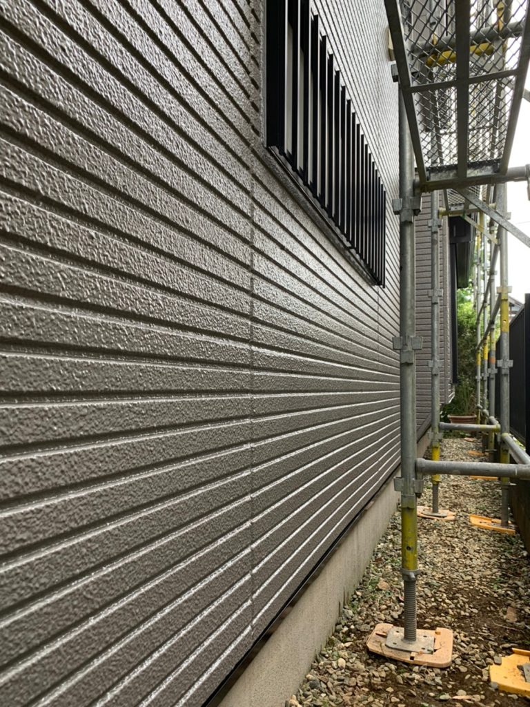 ↑外壁塗装 3回塗り 仕上がり後の様子。外壁塗装には、ラジカル制御型 日本ペイント ファインパーフェクトトップを施工。色は日塗工 19-50A という番号の淡いチャコールグレー色を施工して、全体的なバランスがとてもシックに仕上げることができました。