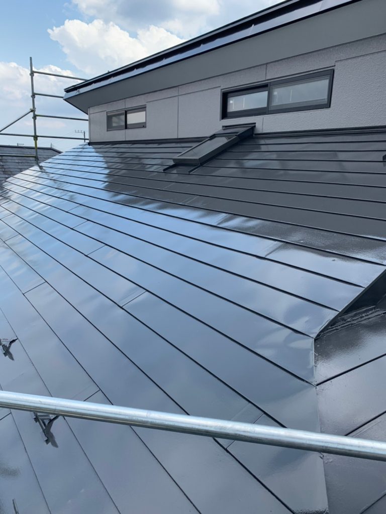 ↑屋根上塗り 2回 合計3回塗りの施工が完了した後の写真です。新築時以上の輝きを取り戻すことができました。今回は日本ペイント ファインパーフェクトベスト という、ラジカル制御型の塗料を施工。色はディープグレーという一見ブラックに見えますが、若干グレーが入った上品な色で仕上げました。