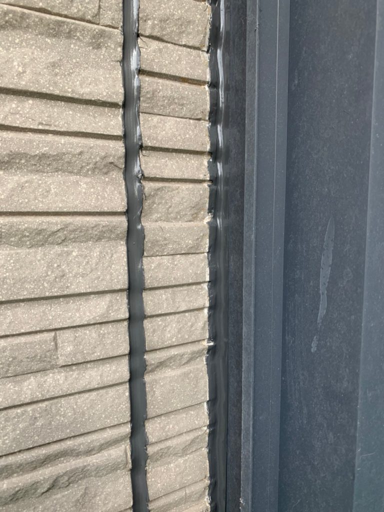 こちらが外壁目地シーリング施工後。今回は外壁の仕上げ色に近いグレー色のシーリング材を施工。オートンイクシード15+という、高耐久 20年以上の耐候性を持ったシーリングで、外壁からの防水性能を創り上げていきます。
