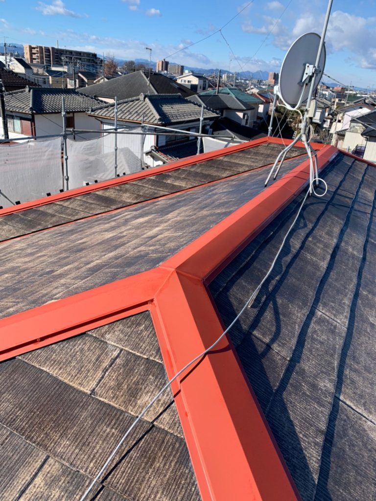 屋根は化粧スレート屋根。セメント系の屋根材ですので表面の防水性能を戻していく必要があります。高圧洗浄後、シーラーで傷んだ屋根材を補強し、棟のトタン部分にもさび止めを塗装。