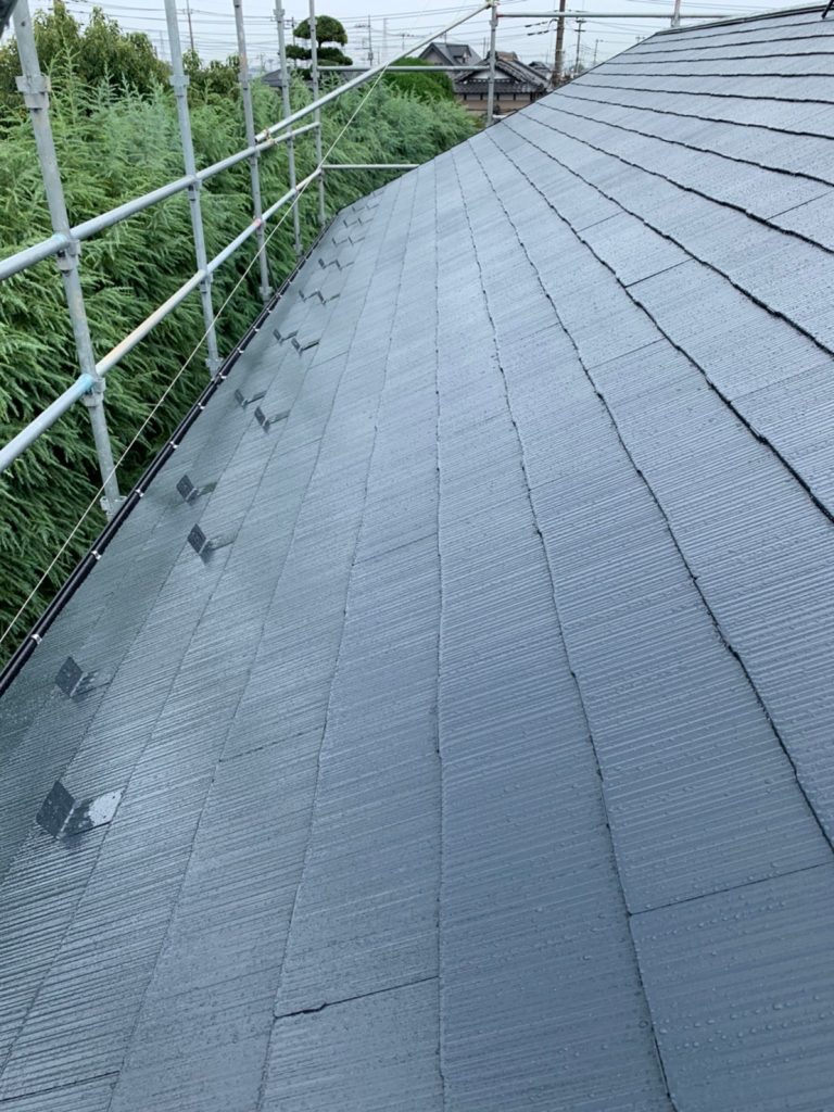 ↑こちらは屋根塗装前の高圧洗浄工事施工後。高圧洗浄でこれだけ屋根表面のコケや劣化した塗膜などがきれいに落ちてしまいます。化粧スレート屋根の塗装の際には、下地への密着などを確実にするためにも、この洗浄工事の工程はとても大切なものになります。