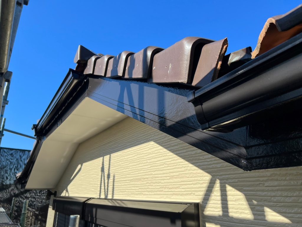 ↑外壁や破風板 雨樋などの付帯部は、無機フッ素塗料にて塗装。せっかくの塗り替えですので、美観が長持ちするように高耐久の塗料でしっかりと塗膜をつけていきたいものです。見違えるように建物が艶を取り戻し、きれいに変身します!