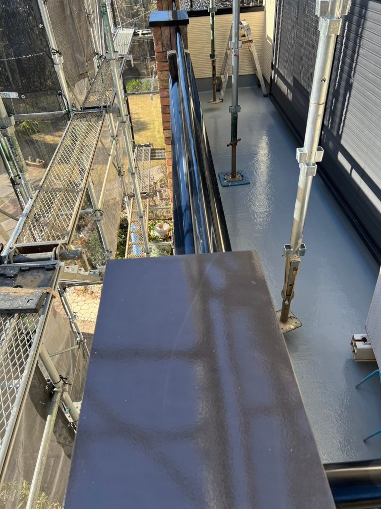 ↑バルコニー床 FRPトップコートの施工も行いました。防水面自体が劣化しているというよりは、そこを保護するトップコートが劣化している場合が多いです。お化粧直しも兼ねて、トップコートの塗装を行うと良いですね。