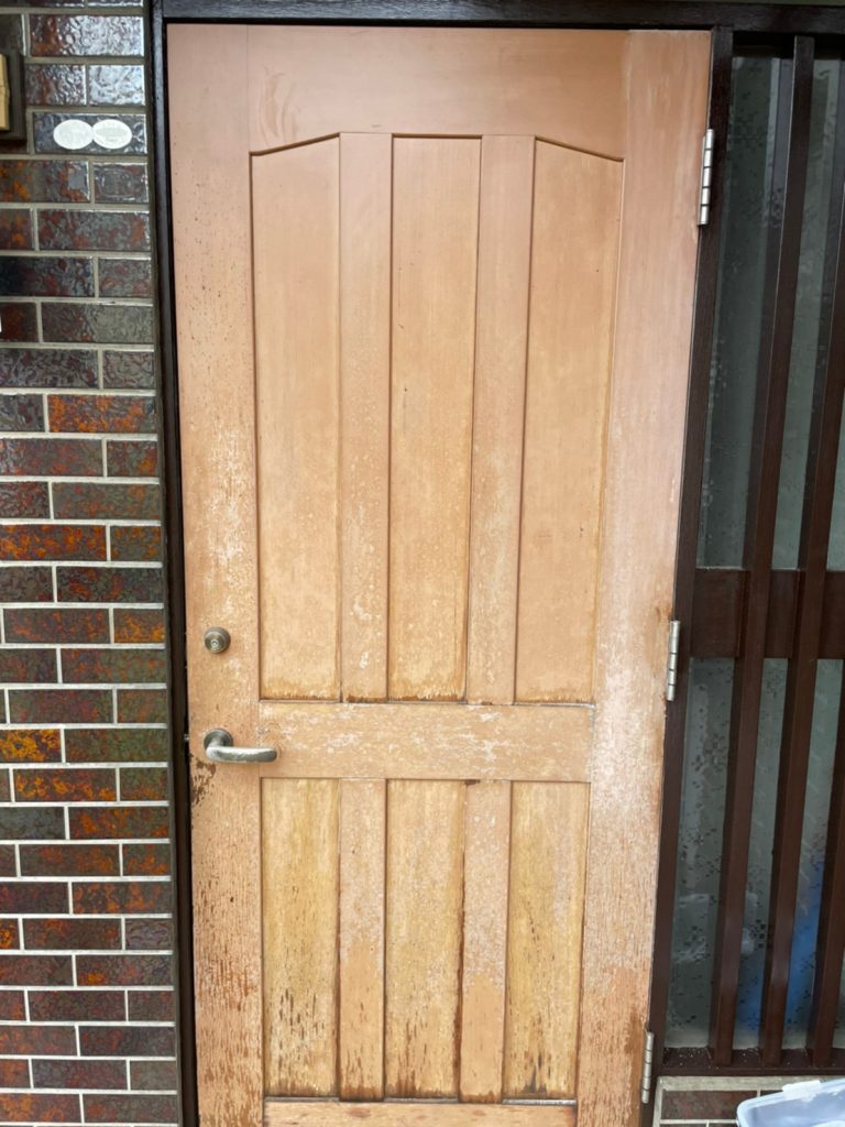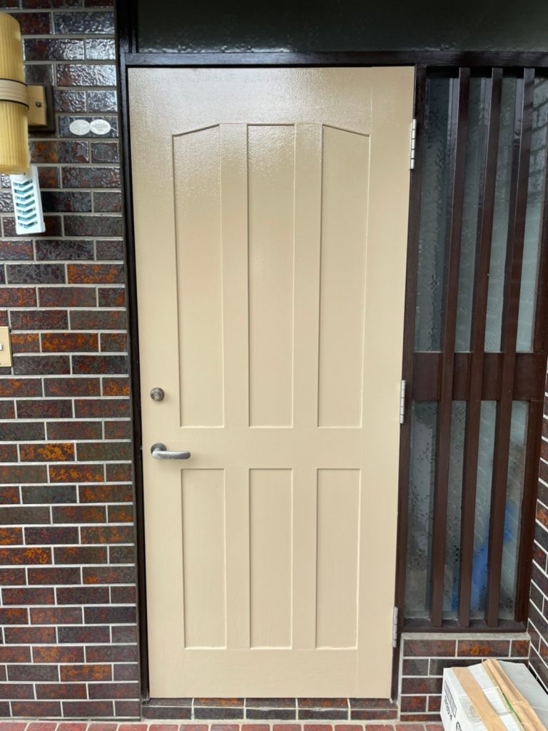 玄関ドアも最後に塗装をして新品のような輝きを取り戻しました。お施主様も「玄関が見違えるように明るくなった!」とお喜びの言葉を口にしていただき、こんな一言が私たちのやりがいをもっとも感じる瞬間です。担当の小林も頑張って心を込めて仕上げてよかったと実感しています。