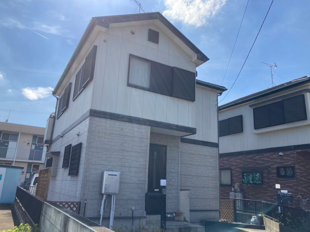 こちらのお客様は、数年前に外壁屋根塗装のお見積りをさせていただき、今年になってタイミングが合い施工のご依頼となりました。窯業系サイディングの表面の防水性能低下・色褪せ・外壁材の反り、また外壁目地やサッシ回りのシーリングも傷みが進み深刻な劣化状況となっておりました。