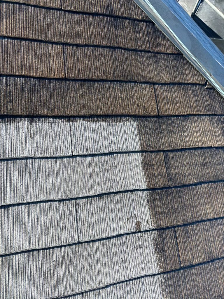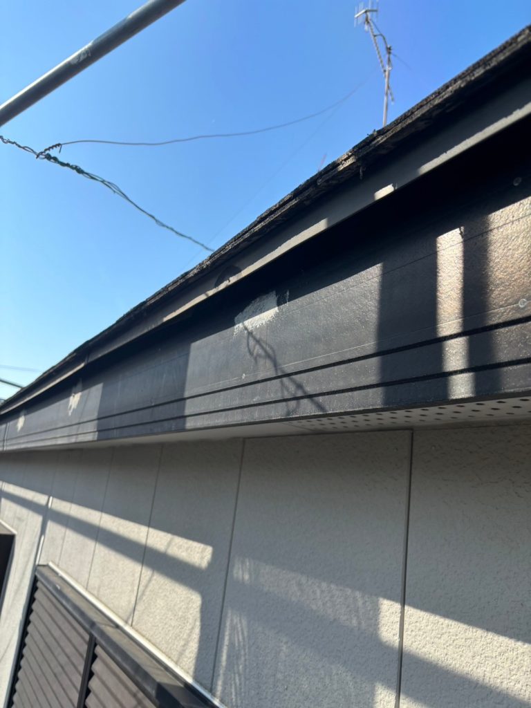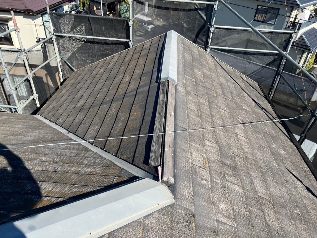 ↑屋根は化粧スレート屋根。屋根材の劣化 コケの発生 色褪せなど防水性能低下 美観の低下が進んでいましたが、同時に棟板金の木下地も腐食し、一部板金も剥がれている深刻な状況でした。今回のメンテナンスでは棟板金の下地も全て交換し、欠落した棟板金もガルバリウム鋼板で補修しました。