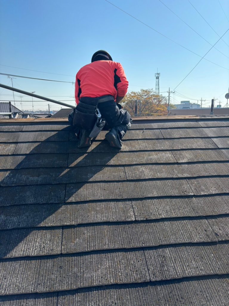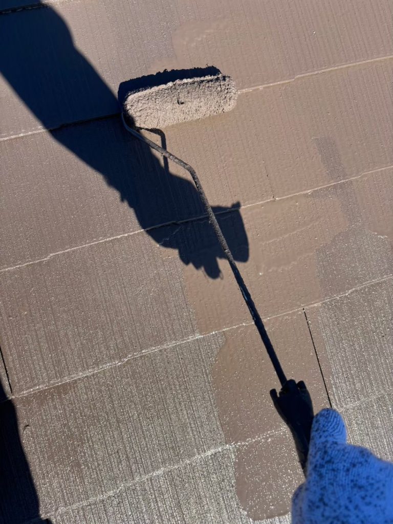 ↑屋根の下塗り。劣化した化粧スレート屋根材に高圧洗浄後、しっかりと下塗りの浸透性シーラーをしみこませていきます。通常のメーカー標準仕様は3回塗り、下塗りシーラー1回 + 上塗り2回塗りなのですが、弊社では劣化状況により下塗りを2回塗装してしっかり造膜させてから上塗りを施工しております。