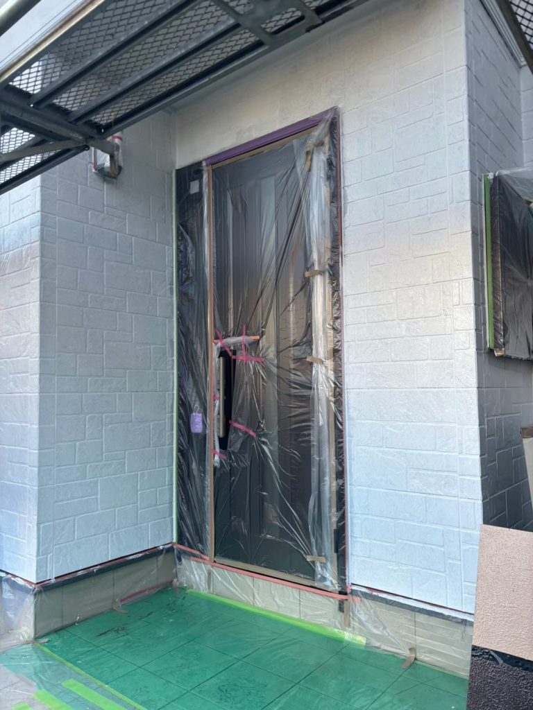 ↑外壁下塗り施工中。白くなっているところは、外壁下塗り 日本ペイント パーフェクトサーフを塗装。下地の劣化を補強しつつ、上塗りの密着性も上げていきます。