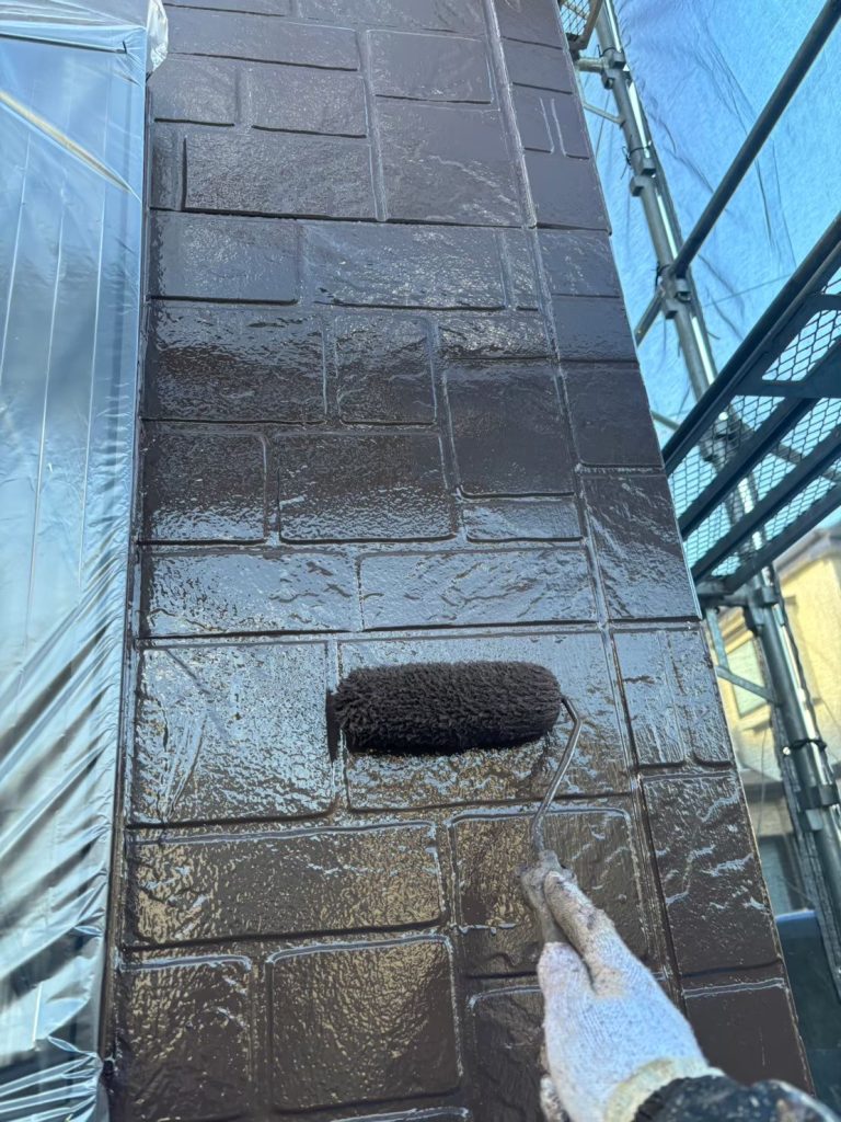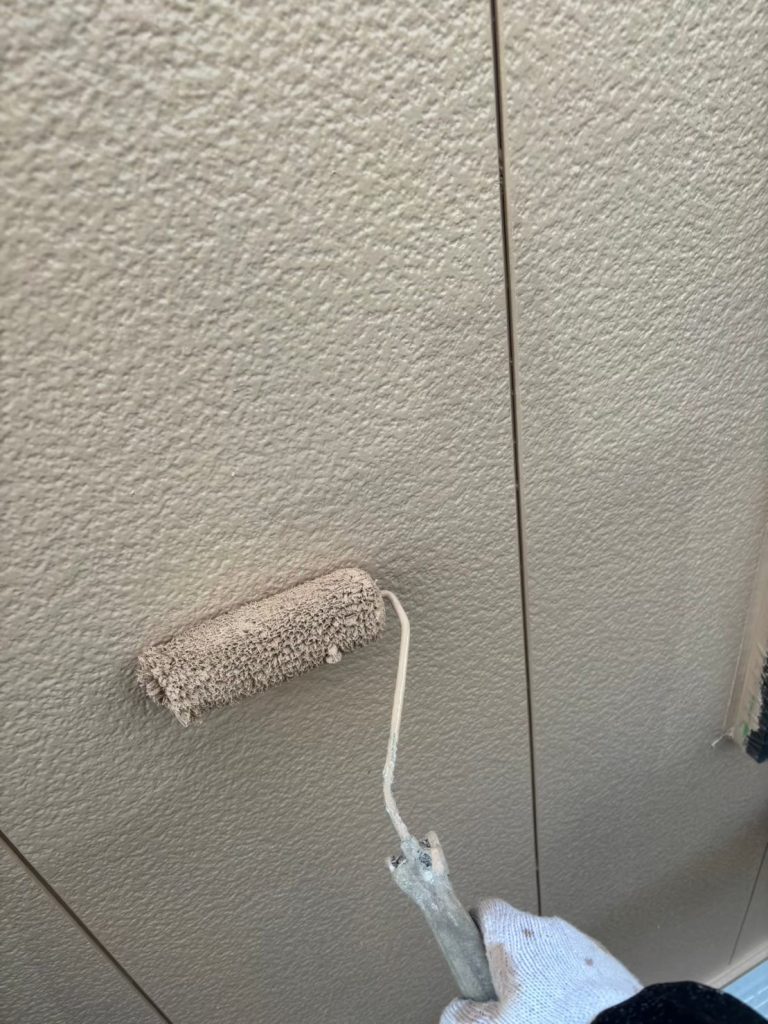 ↑最後は上塗りを2回塗り。一回ずつ乾燥させ、膜を作って重ねていくことでメーカーさんが言っている通りの対候性が実現します。時間をかけて丁寧に、刷毛やローラーで仕上げていきます。